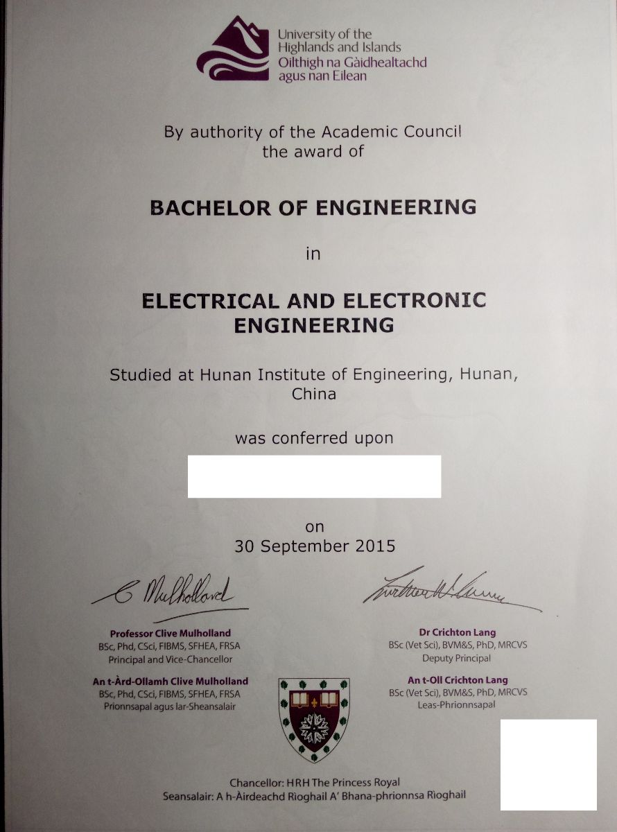 (1)就读电气工程及其自动化本科项目,成绩合格的学生,可获得2138cn太阳集团古天乐颁发的本科毕业文凭和工学学士学位。第四学期末,学生英语成绩达到要求的,可注册为UHI海外学生,第三年学生不出国在修完UHI专业课程后,成绩合格可获得UHI的电气及电子工程普通学士学位(BEng in Electrical and Electronic Engineering)。
