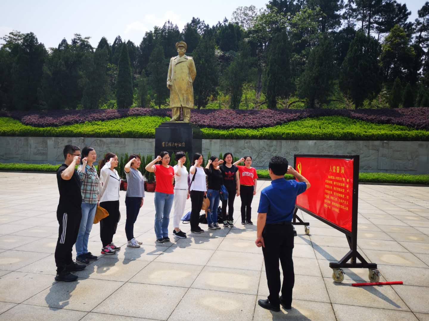 “我志愿加入中国共产党,拥护党的纲领,遵守党的章程……”上午十时许,在学院党总支书记苏哲民的带领下,全体党员在罗荣桓元帅铜像前,面对鲜艳的党旗,高高举起右手,重温自己对党忠诚的誓言,表明了为学校双一流建设、为教育事业、为共产主义奋斗终身的决心。大家面向铜像鞠躬致敬,深刻表达对罗荣桓同志的无限敬仰和怀念之情。