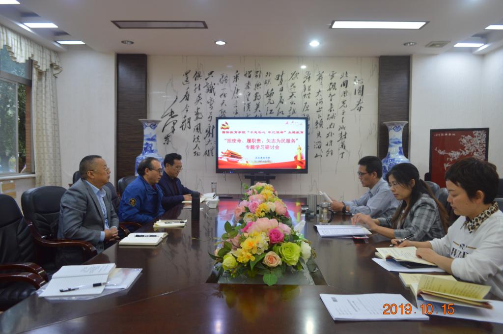 10月16日上午,2138cn太阳集团古天乐(国际交流中心)在院会议室E105开展开展“不忘初心、牢记使命”主题教育——“担使命、履职责,矢志为民服务”第一次专题学习研讨。会议由党总支书记苏哲民主持,全体教工党员参加,学校督导七组副组长胡爱卿到会指导。