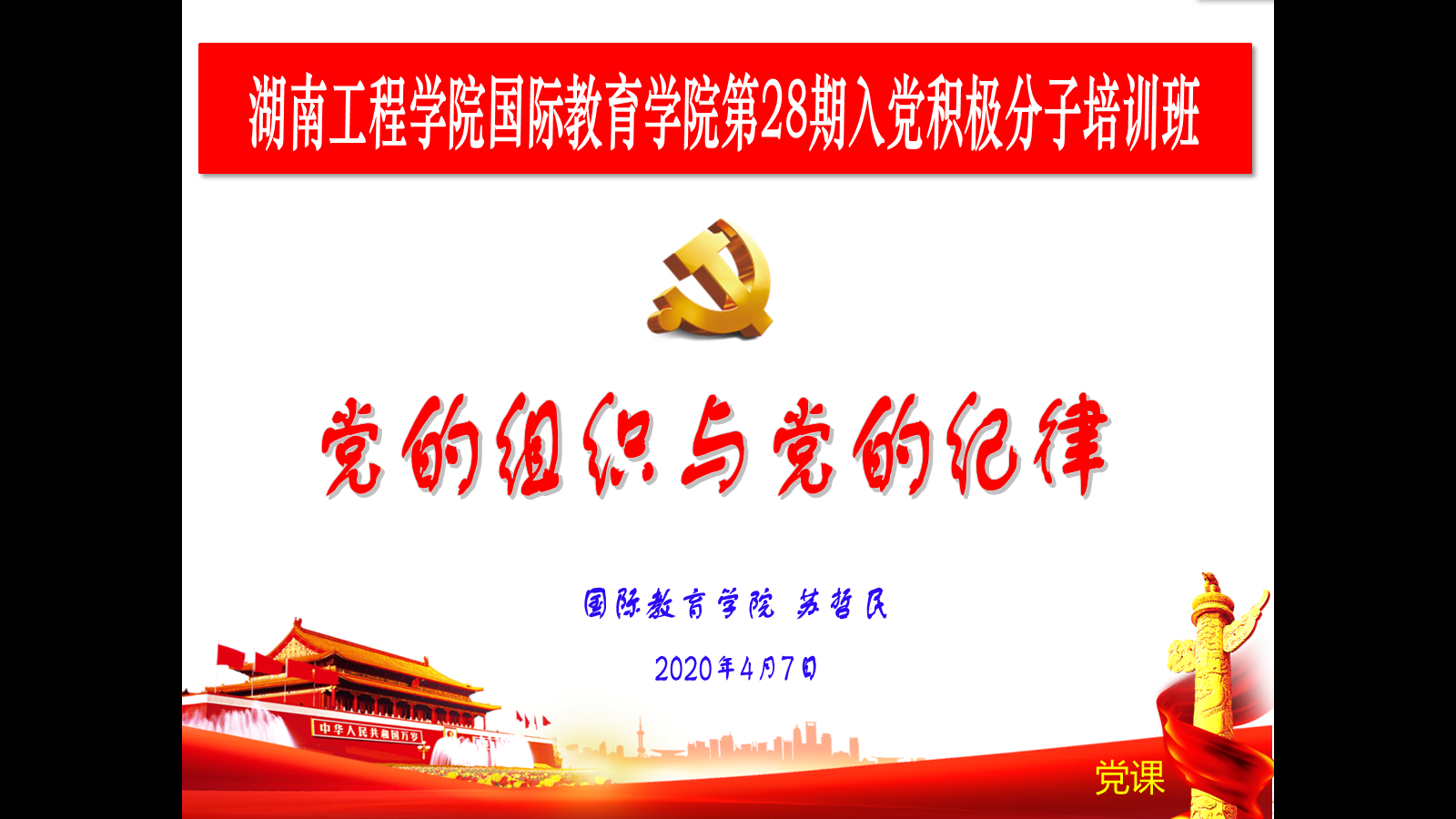 2020年4月7日晚7:00,2138cn太阳集团古天乐党总支书记苏哲民为学院分党校第28期入党积极分子培训班学员讲授了一堂 “党的组织与党的纪律”党课。