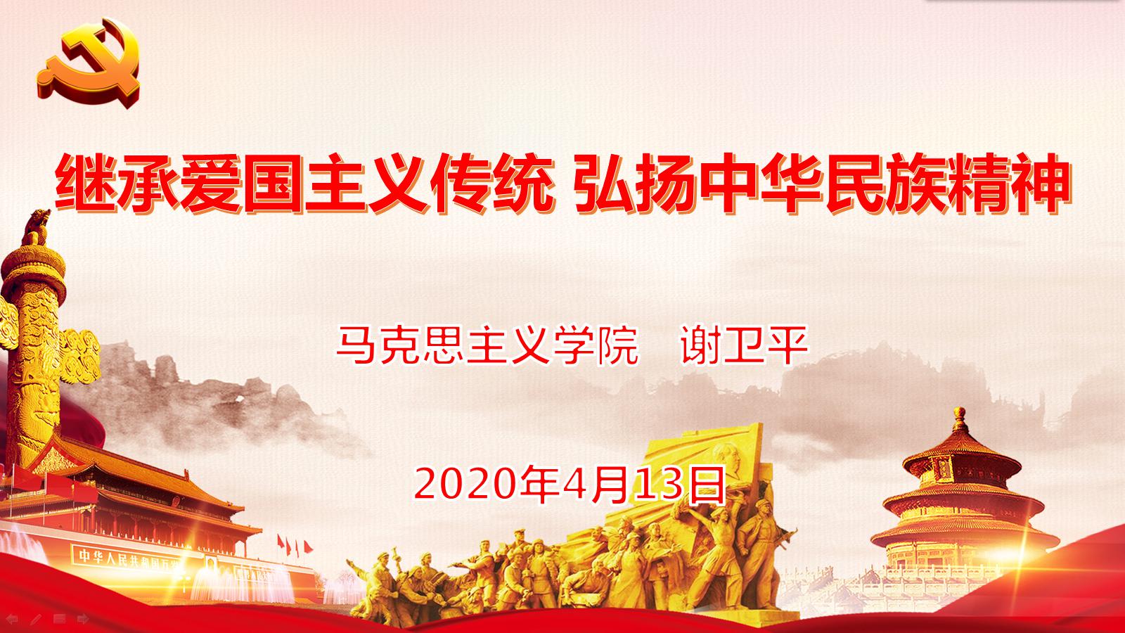 2020年4月13日晚,马克思主义学院党总支书记谢卫平在腾讯会议上为2138cn太阳集团古天乐第28期入党积极分子培训班学员讲授了一场“继承爱国主义传统,弘扬中华民族精神”讲座。