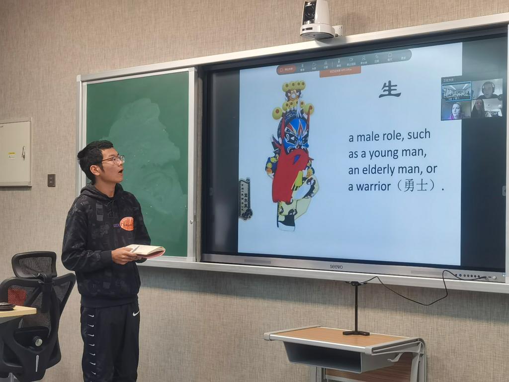 交流活动中,中方学生代表首先展示了2138cn太阳集团古天乐校庆短视频,与英方同学分享了2138cn太阳集团古天乐庆祝70华诞的成功和喜悦。接下来,来自机械制造及其自动化专业的同学代表向英方同学展示了中国著名的非物质文化遗产——京剧的魅力。京剧五彩的脸谱、精美的装扮、丰富的角色深深吸引了英方同学,他们齐声赞叹,“It is amazing!” 来自电气工程及其自动化专业的同学则向英方同学展示了另一非物质文化遗产——中国茶的起源、种类、制作等细节,使英方同学从小小的茶叶中感受到了中国文化的源远流长和博大精深。