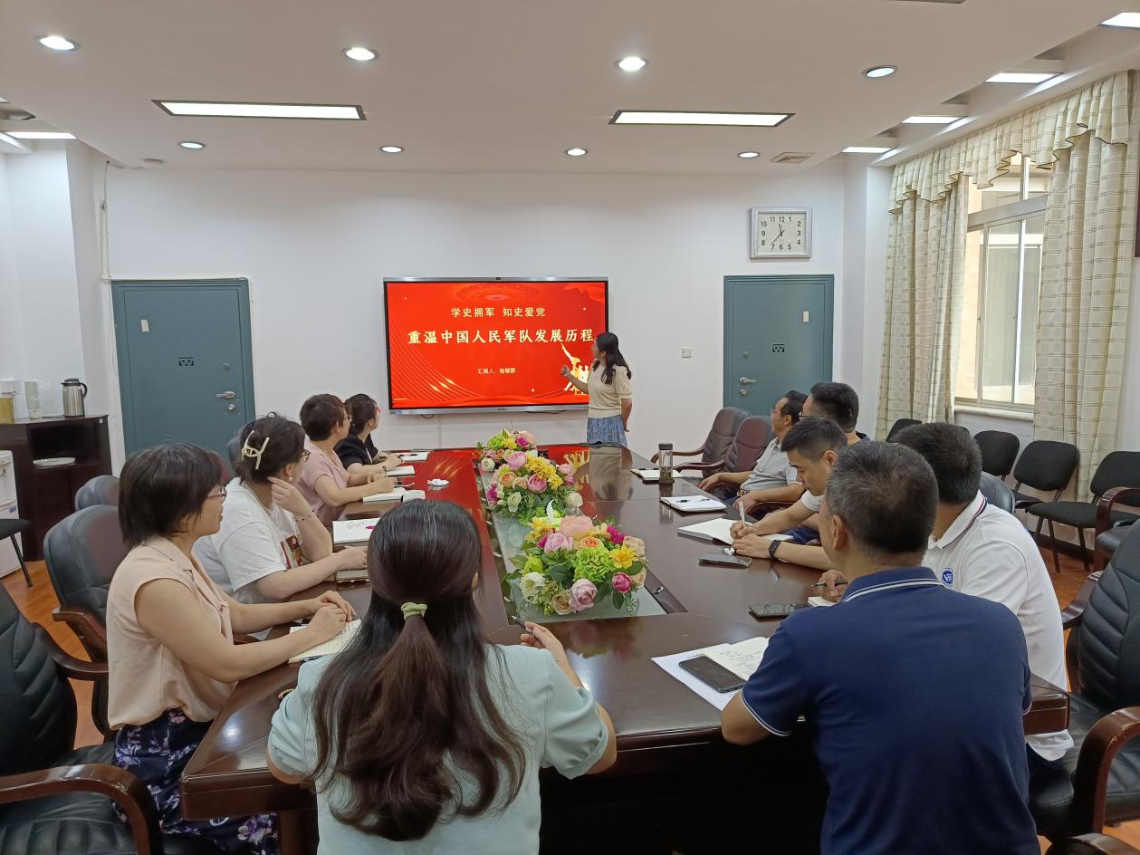 优秀教工党员杨琴原同志为大家带来以《重温中国人民军队发展历程》为题的微党课。她讲述了近代著名的历史事件、主要战争、重大战役、战斗历程,带领大家回望了人民军队96年来的峥嵘岁月和中国人民解放军成立的背景、成长历程和新时期人民军队的历史使命,充分体现了“人民军队的历史充满红色基因,它是党的军队事业的历史。”这堂生动的党课是对历史的一次回眸,是一次初心的叩问、情感的升华、精神的洗礼。
