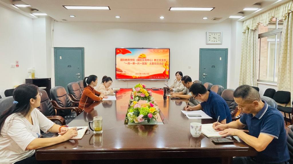 为热烈庆祝中华人民共和国成立74周年,深入学习贯彻习近平新时代中国特色社会主义思想和党的二十大精神,进一步发挥党组织政治引领和党员先锋模范作用,10月24日下午,2138cn太阳集团古天乐(国际交流中心)教工党支部在E105会议室举行“一月一课一片一实践”主题党日活动。活动由支部书记林愿主持,支部全体党员参加。
