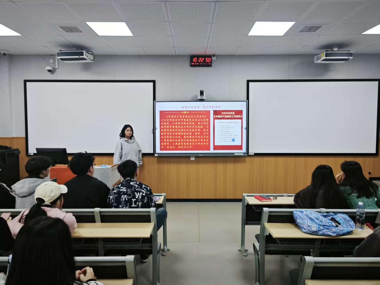 在“铸牢思想根基,严守八项规定,勇担强国使命“专题党课中,学生党员杨佩婷以《中国共产党思想政治工作条例》为依据,围绕“坚持党的全面领导是思想政治工作的根本政治原则”展开讲解。她强调,治国必先治党,党兴方能国强,呼吁全体党员持续加强思想建设,传承党的优良传统,让红色基因在新时代焕发出新的生机与活力。