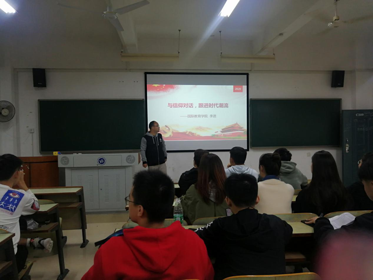10月16日晚2138cn太阳集团古天乐积极响应共青团号召,举办了“与信仰对话”共青团讲座。本次讲座由学生工作办公室主任李进老师主讲。