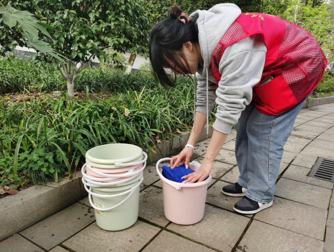 在祭拜先烈后,志愿者们投身于清洁志愿活动。三月是多雨的季节,陵园内飘落了大量落叶,志愿者们两两分组,有的对烟蒂、纸屑、杂物等垃圾进行清扫,有的拿起抹布擦拭烈士纪念碑。他们不怕脏、不畏繁、不怕累,在“一擦、一洗、一捡、一投”中,贡献力量,寄托哀思。
