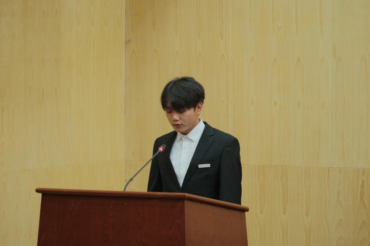 新一届团学会执行主席李汉钦发表任职感言。他谈到,自己作为新的“接棒者”深感荣幸,感谢学院老师的信任与支持,换届不是终点而是起点,是责任与传承,自己有信心在新的学年里,与其他同学一起尽情挥洒汗水,相互学习、共同进步,向着学院团学工作更灿烂的未来出发。