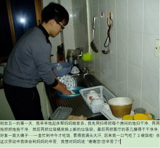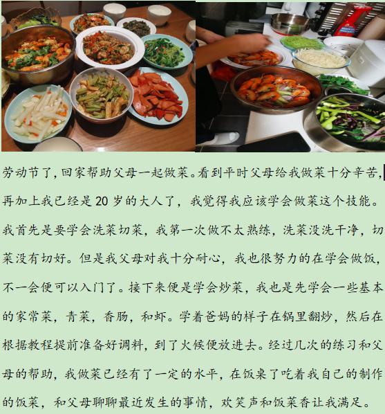 202151日,趁着五一劳动节,为了让同学们与父母在假期内更好的进行沟通交流,我院学生工作办公室和心理部组织了一次点滴的爱心理健康教育特色活动。活动采用手机摄影的方式,记录假期内与父母互动的点滴过程并用简短文字描述,如做饭、打扫卫生等。全院同学积极踊跃参加了本次活动透过作品我们可以感受到家庭的温馨同学们与父母一起劳动的快乐,同学们也真切体会父母艰辛。