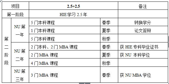(2)2.5+2.5项目指HIE专科学生,两年半在HIE就读,两年半在NU就读,完成全部课程,可获得HIE专科毕业证及NU学士学位、硕士学位。