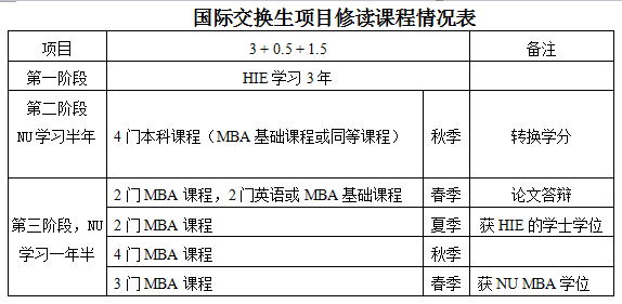 (1)3+0.5+1.5项目指HIE本科学生,3年在HIE就读,半年在NU就读,1.5年在NU完成硕士课程,完成全部课程,可获得HIE的学士学位和NU硕士学位。