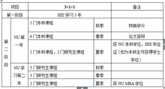 (3)3+1+1项目指3年在HIE就读,两年在NU就读,完成全部课程,可获得HIE毕业证(如为本科生可获得学士学位)、NU学士学位和硕士学位。