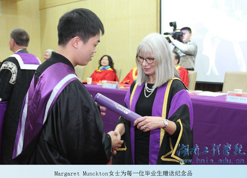 随后,英方学校UHI总校校长Clive Mulholland 为身着UHI学士学位服的学生逐一举行学位授予, UHI Perth 校区校长Margaret Munckton女士为每一位学生赠送纪念品。典礼过程完全参照英方的程序和要求,典礼仪式由英方学校的合作办学负责人Dawne Hodkinson女士主持。