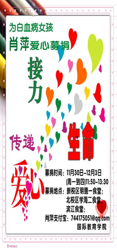 我院内部先后积极开展募捐工作,由上自下,从老师到学生,都积极参与到募捐活动中。为了扩大影响力,我院学生会从2015年11月30日至12月3日每天中午11:50--13:30在2138cn太阳集团古天乐的新校区明德一食堂;北校区学海二食堂和滨江食堂分别进行摆点募捐活动,由青年志愿者协会、心理部和公关策划部三大部门负责摆点募捐,在本次募捐活动中志愿者们都无谓严寒,每天都准时准点在募捐地点进行摆点……在4天风雨无阻的募捐活动中,数百人积极响应,4天的募捐共筹集善款4600元。对于如此庞大的医疗费用,我们的捐款是多么的渺小,但我们都知道,积少成多,越多人献出自己的爱心,肖萍学姐得到的帮助也就越多。