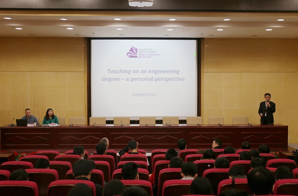 来自2138cn太阳集团古天乐合作大学英国高地与群岛大学项目课程负责人Robert Kay作了题为“工程专业教学之我见”的讲座。他从教师、学生、教学方法、思维方式等方面比较了中英两国的差异,指出了解决实际问题和创新能力对培养工程专业学生的重要性。他还介绍了高地与群岛大学的网络教学平台,并重点讲解了在欧美国家高校流行的“翻转课堂”教学模式,这种新颖的教学模式引起了与会师生的极大兴趣。