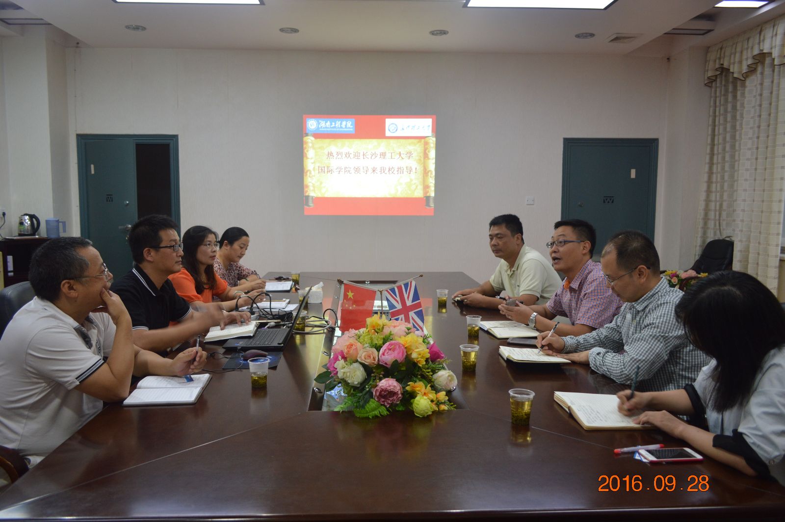长沙理工大学国际学院副院长段胜峰一行感谢我院的经验分享,同时交换了他们在中外合作办学方面的成功经验。邓奕院长表示,希望不断加强两校间的交流与合作,进一步增进友谊,促进两校的共同发展。