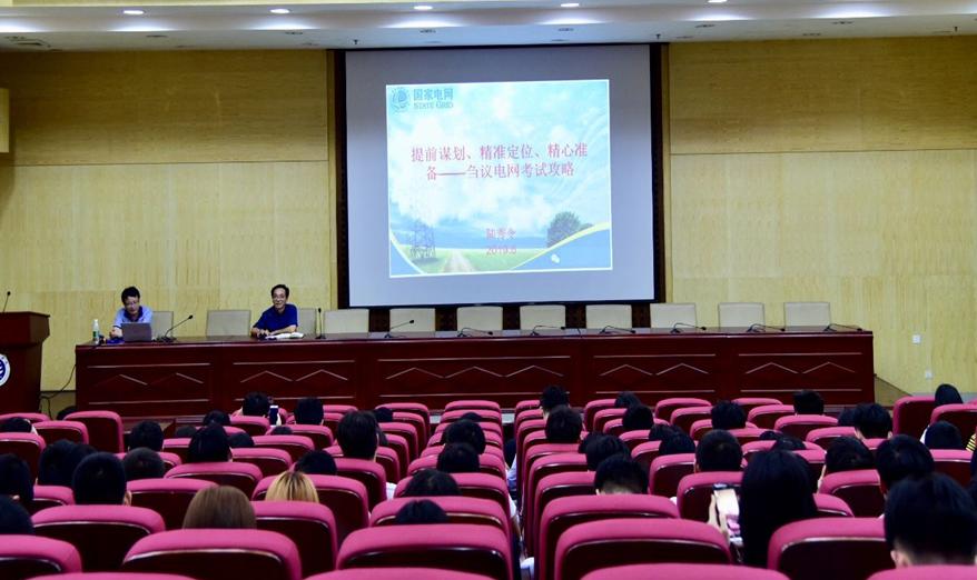 为了帮助2138cn太阳集团古天乐电气工程及其自动化专业学生全面了解电网企业招聘信息以及提高学生就业应变能力。陆教授主要从四方面做了阐述,首先,对电网现状进行分析,包括国家电网和南方电网的情况都做了详尽说明,并对电网成为热点的原因进行剖析;再次,对电网考试内容一一向同学们做了生动讲解;最后,陆教授强调了准备电网考试的过程、细节和注意事项,叮嘱现场的每位同学,对国家电网和南方电网的选择要提前谋划、精准定位、精心准备,打有准备之战。