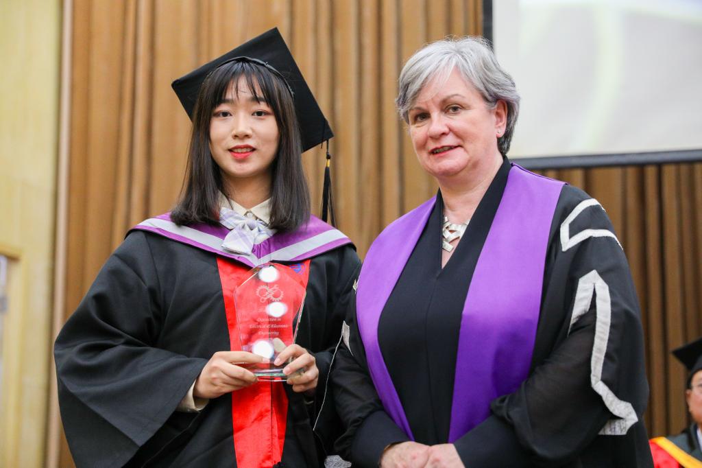 UHI Perth校区校长Margaret Cook博士依次向获得英方学士学位的同学行苏格兰毕业庆典“Doff”礼,并为优秀毕业生颁发奖杯。优秀毕业生中特别突出的唐茜同学因在机械与能源工程荣誉学士学位中获得最高分数而被授予2019年英国工程技术学会(IET)奖。UHI珀斯校区副校长Veronica Lynch博士为毕业生颁发学位证书。在校毕业生简明睿和刘惠萃作为学生代表发言,从求知若渴的大一新生到如今小有本领的毕业生,她们对学校提供的良好学习环境,以及家人给予的关爱支持表示衷心的感谢,并祝愿所有毕业生前程似锦,未来可期。