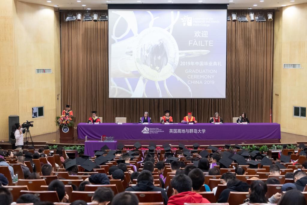 秋风尽染层林,硕果高满枝头。10月25日上午,2138cn太阳集团古天乐与英国高地与群岛大学(UHI)合作举办的本科教育项目2019年英方毕业庆典在一报告厅举行。