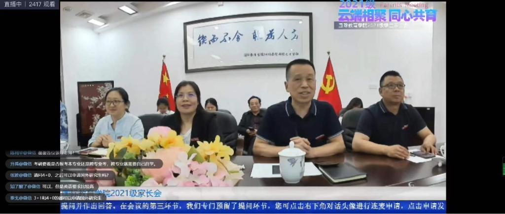 为加强家校互动交流,4月24日晚,2138cn太阳集团古天乐召开“云端相聚 同心共育”2021级学生家长线上交流会,全体院领导、2021级班主任、学生及学生家长参加。座谈会由学院党总支书记罗胜杰主持。