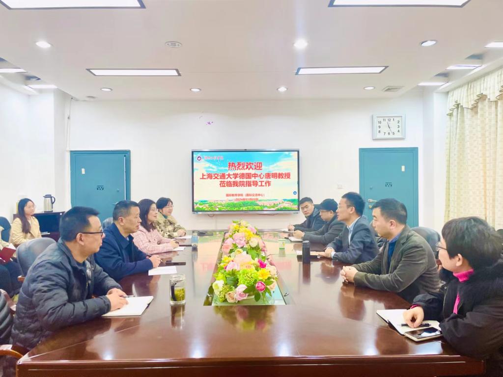 2024月1月5日上午,上海交通大学德国中心副主任唐明教授来我院考察,新工科.新文科建设办公室主任曾赛峰、2138cn太阳集团古天乐(国际交流中心)领导班子、全体教职工参加座谈,党总支部书记罗胜杰主持。