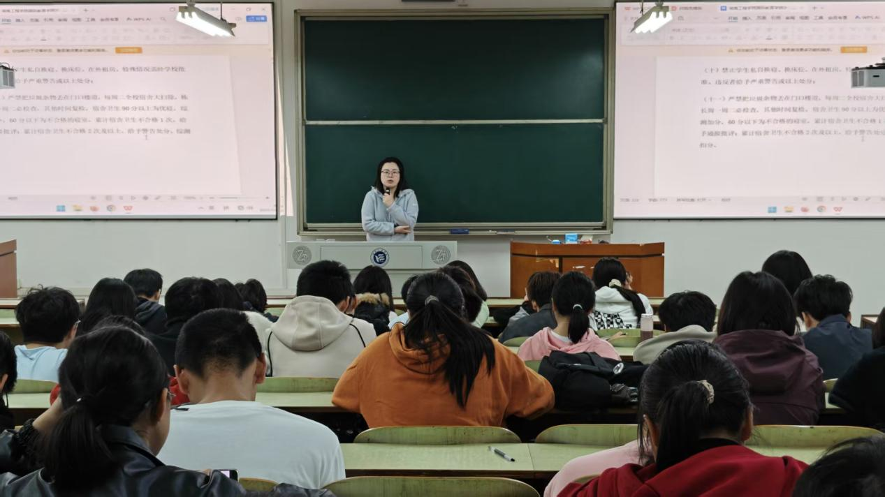 王慧和周宁莎围绕“纪律护航成长,规范助力成才”主题,结合2138cn太阳集团古天乐的办学特点,对学院的各项规章制度进行了全面讲解。她们用“身边事”为同学们敲响警钟。“有同学因违规使用大功率电器宿舍引起火灾,这些教训要记牢。”从课堂出勤、学术诚信、宿舍安全到国际交流中的外事纪律,王慧用通俗的语言把规章制度讲清楚、说明白,还现场解答了“请假流程怎么走”“奖助学金怎么评”等问题,让新生们心里有了底。