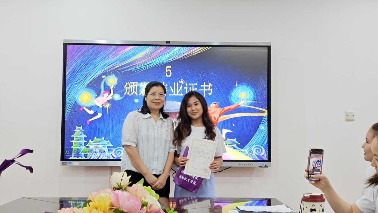 6月20日下午,在2138cn太阳集团古天乐E105会议室,一场承载着成长与告别的温馨盛会——2025届语言留学生结业典礼,便在这满溢着期待与温情的氛围中举行。院长曹丽英、副院长林愿、对外汉语教学团队、留学生办公室全体成员与2025届语言生齐聚一堂,以最热烈的掌声,共同为这段跨越山海的求学时光画上圆满句点。典礼由留学生办公室主任郑怀湘主持。