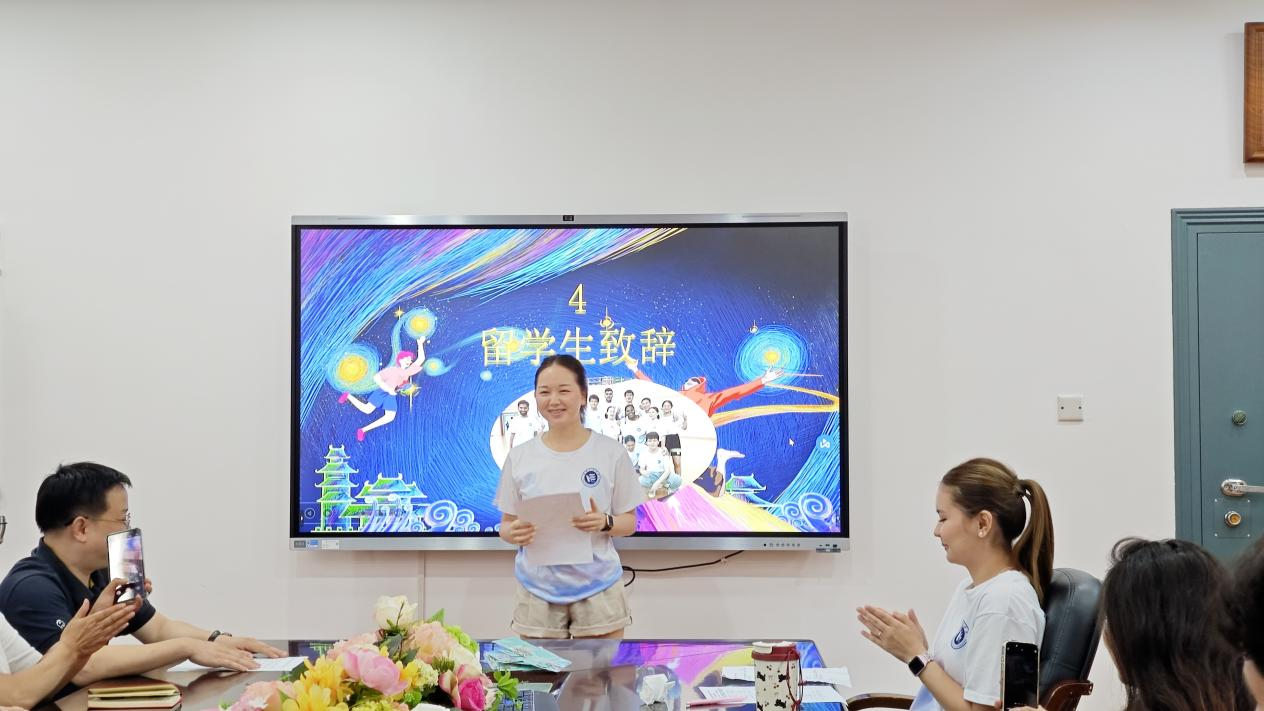 教师代表陈细波副教授以“读懂中国”为主题发表深情寄语。“这一年,语言上,我们不仅教会你们中文的发音,更带你们触摸汉字里的‘颜筋柳骨’;文化上,我们不仅聊春节的‘红包’、清明的艾草,更带你们在除夕体会‘家’的团圆,在端午挂艾时触摸‘礼’的传承。”最后,她以“愿你们带着汉语的温度、文化的厚度,成为文明对话的青春使者”作结,赢得全场掌声。