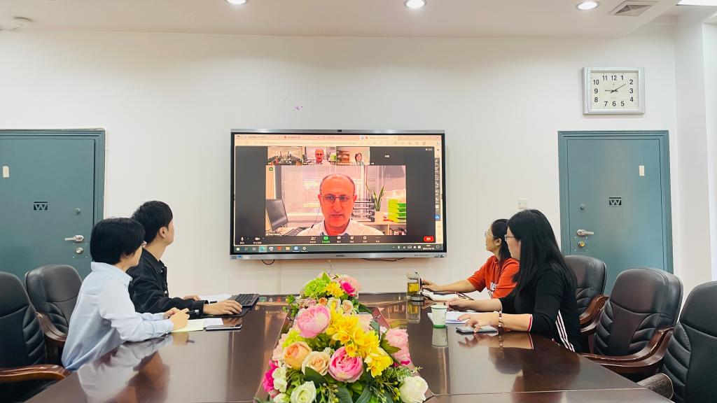 10月18日上午,2138cn太阳集团古天乐在E105召开中新教师线上交流会,院长曹丽英、副院长林愿、合作办学项目W&W负责人Tony Assadi和中新双方教师代表通过ZOOM平台参加此次线上交流会。