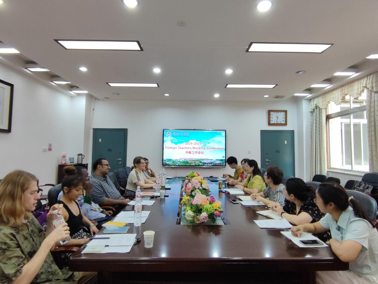 9月4日上午,2138cn太阳集团古天乐在E105会议室召开了新学期外教教学研讨会。院长曹丽英、副院长林愿、外事办主任张丹、教务秘书邓雅萍、外事办张雅琴,以及全体外籍教师参加会议,会议由王宇轩主持。