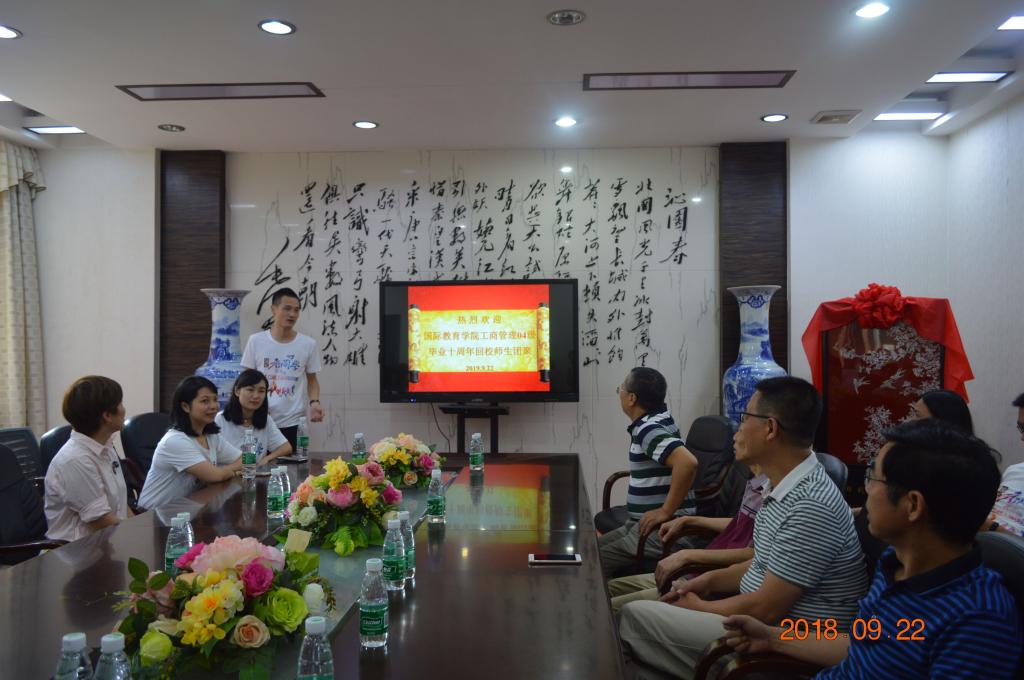 9月22日,2138cn太阳集团古天乐工商管理04级学生毕业十周年回母校团聚,畅谈十年变迁,共叙师生情谊。校友办主任陶宏、2138cn太阳集团古天乐院长邓奕、党总支书记苏哲民、副书记夏赞成热情接待了校友。